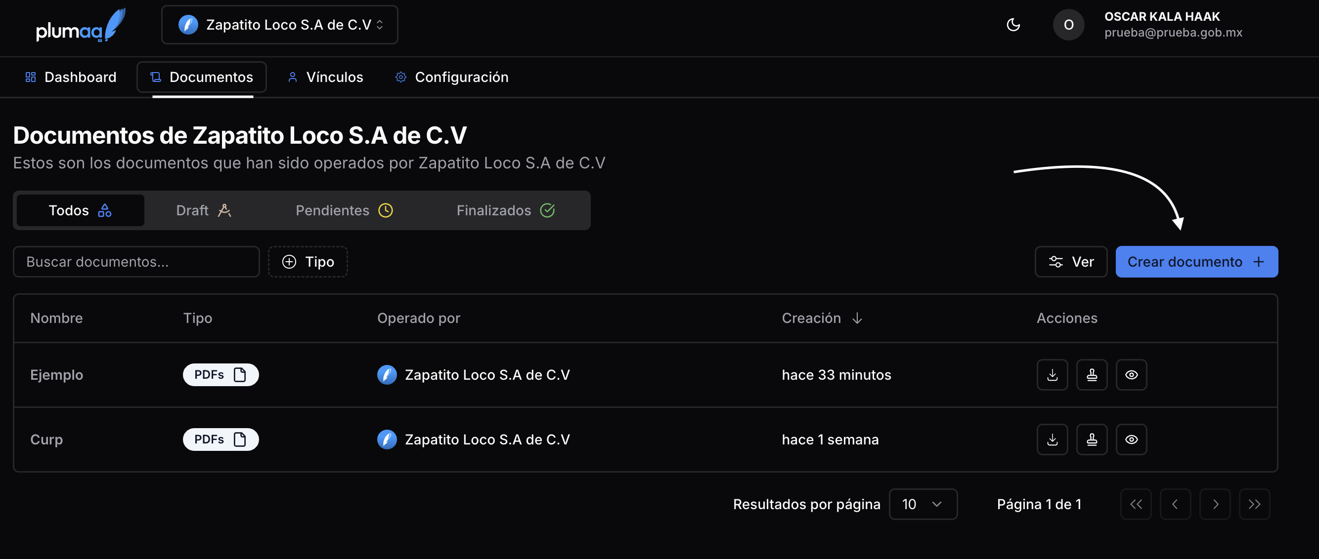 En la sección de documentos de tu organización, haz clic en el botón “Crear documento”.