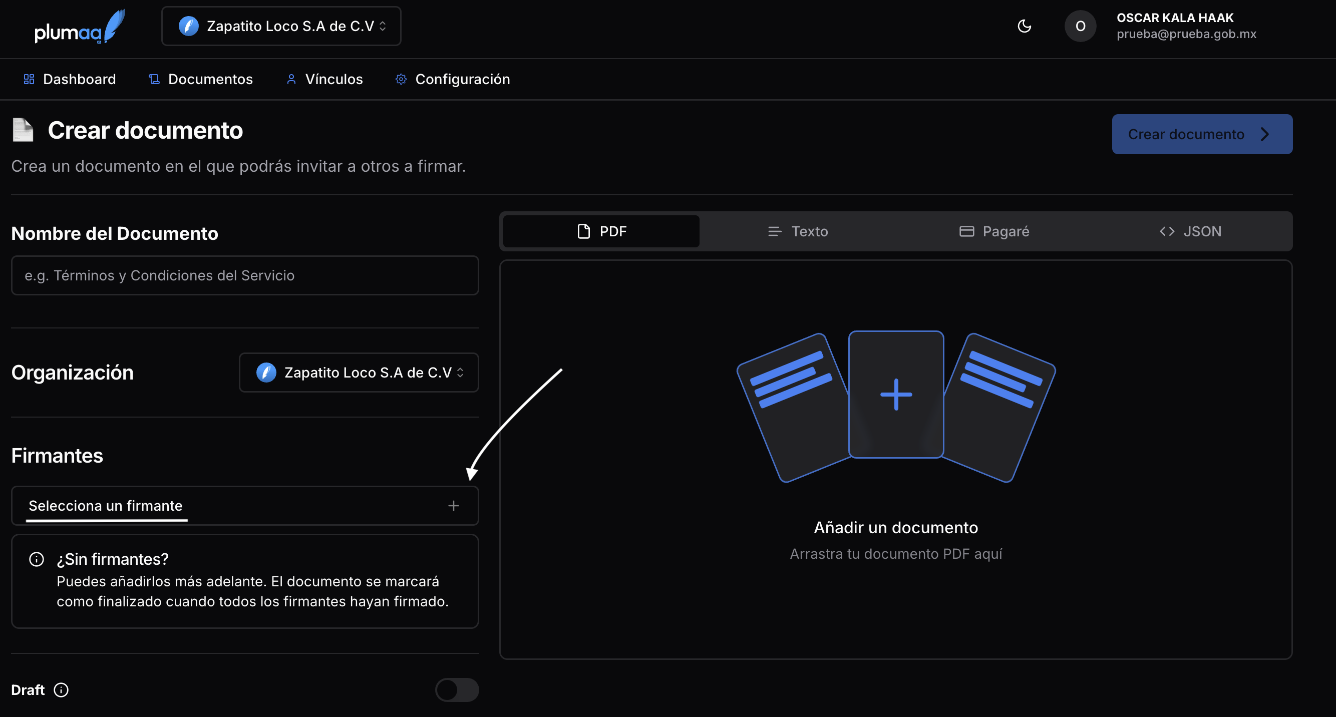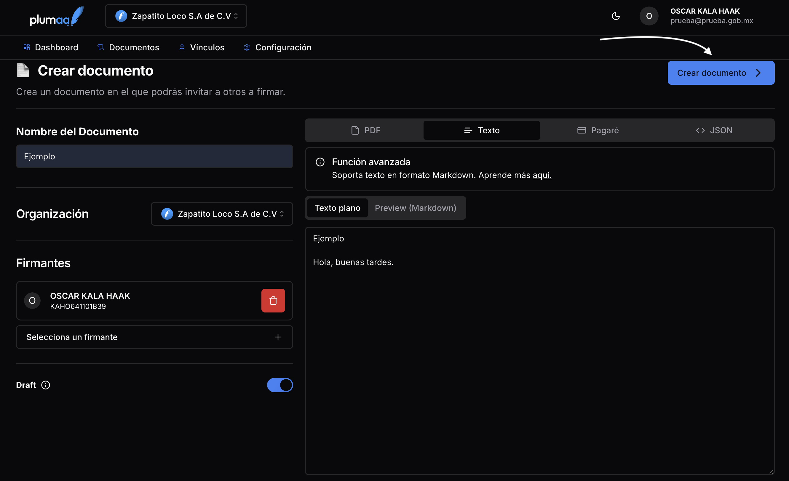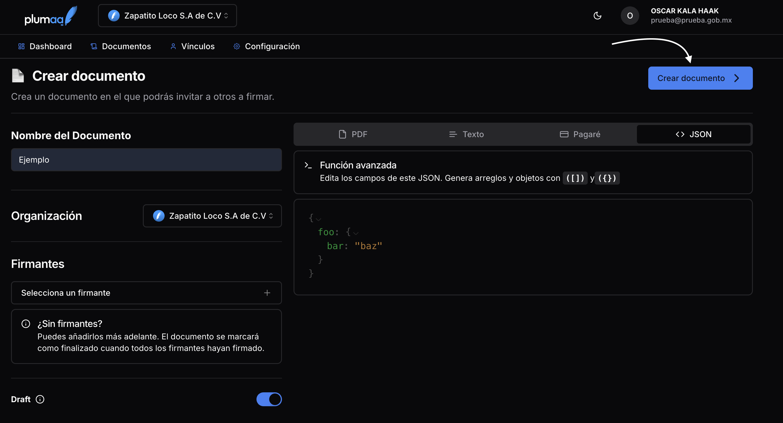 Los documentos en Plumaa ID pueden ser creados desde la interfaz web o a través de la API. El documento puede ser creado como un draft, lo que evitará que los invitados reciban notificaciones hasta que el documento esté listo para ser firmado.1