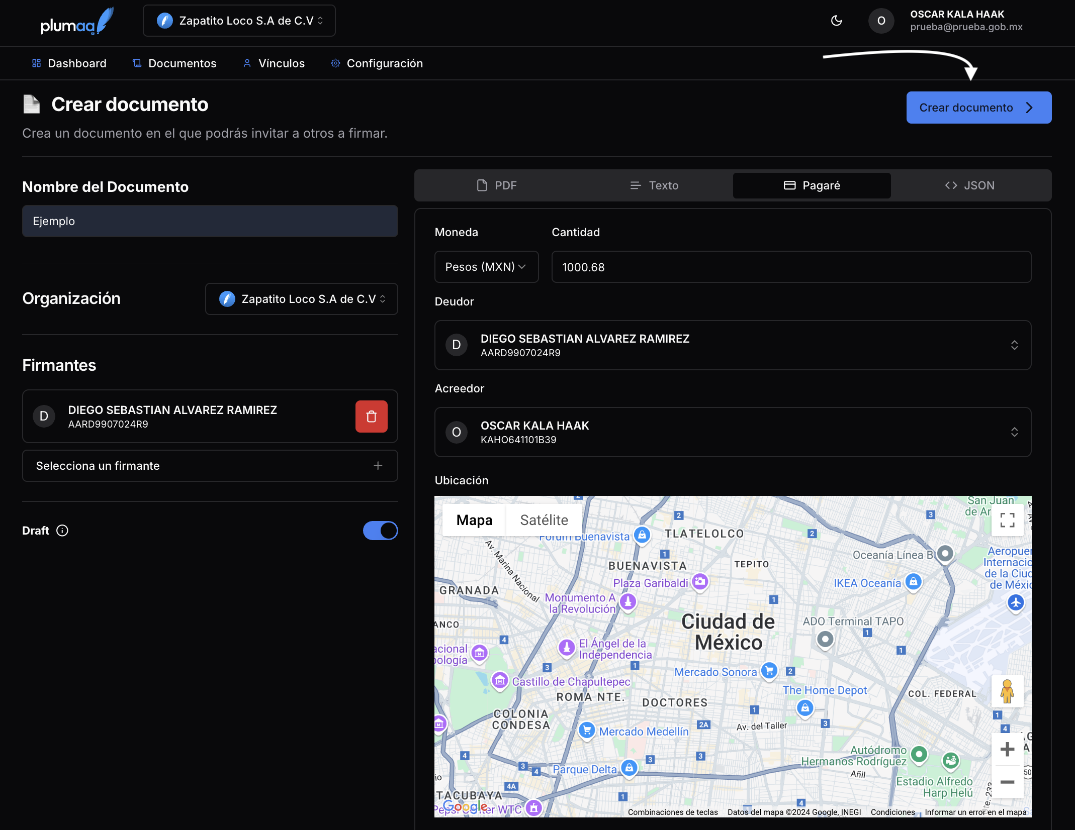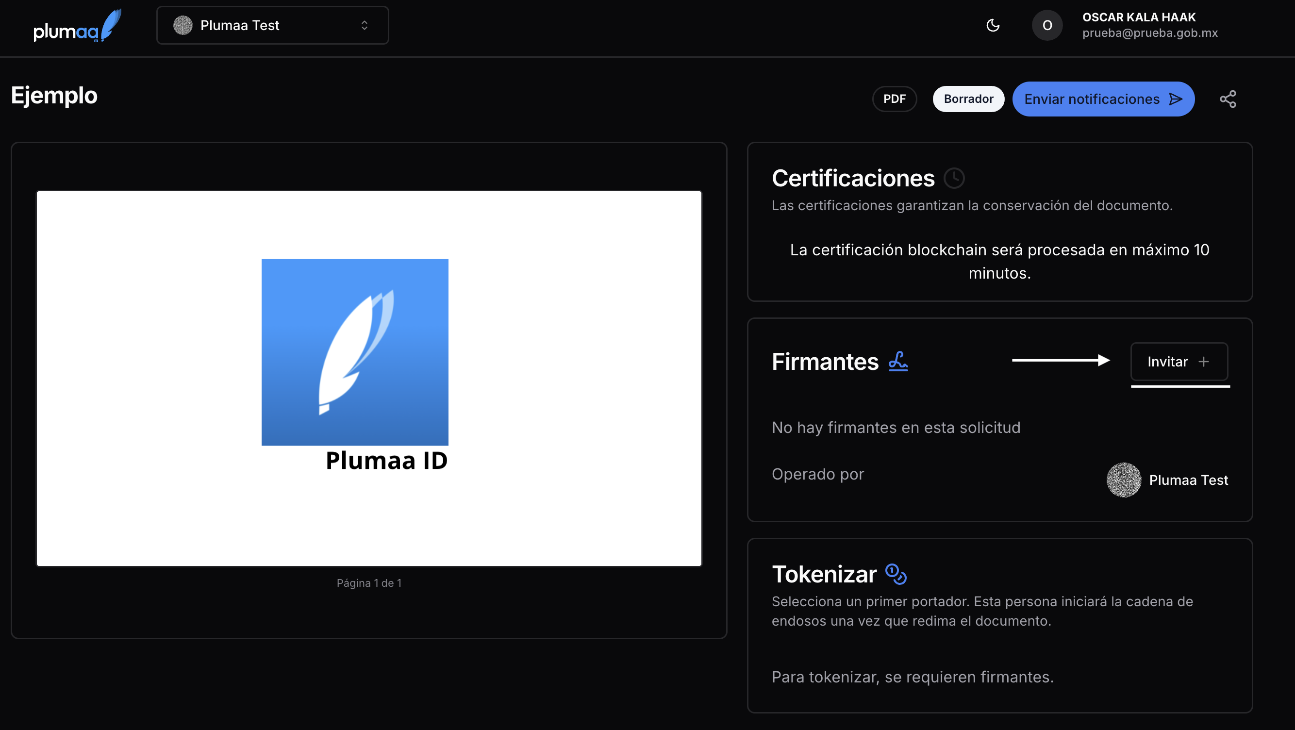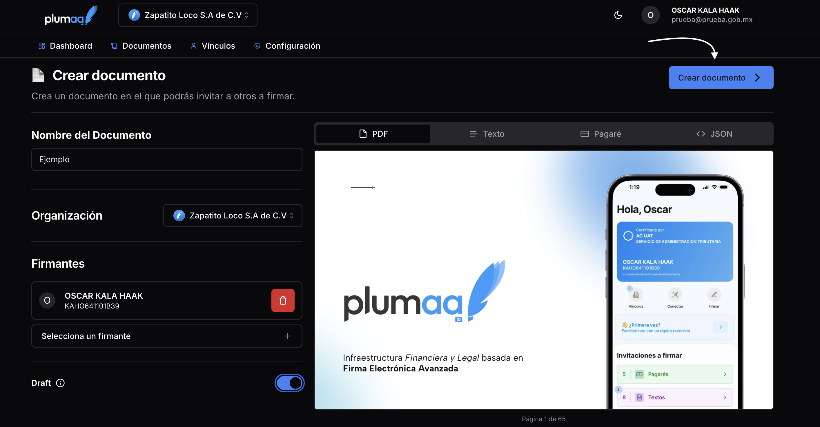 Los documentos en Plumaa ID pueden ser creados desde la interfaz web o a través de la API. El documento puede ser creado como un draft, lo que evitará que los invitados reciban notificaciones hasta que el documento esté listo para ser firmado.1