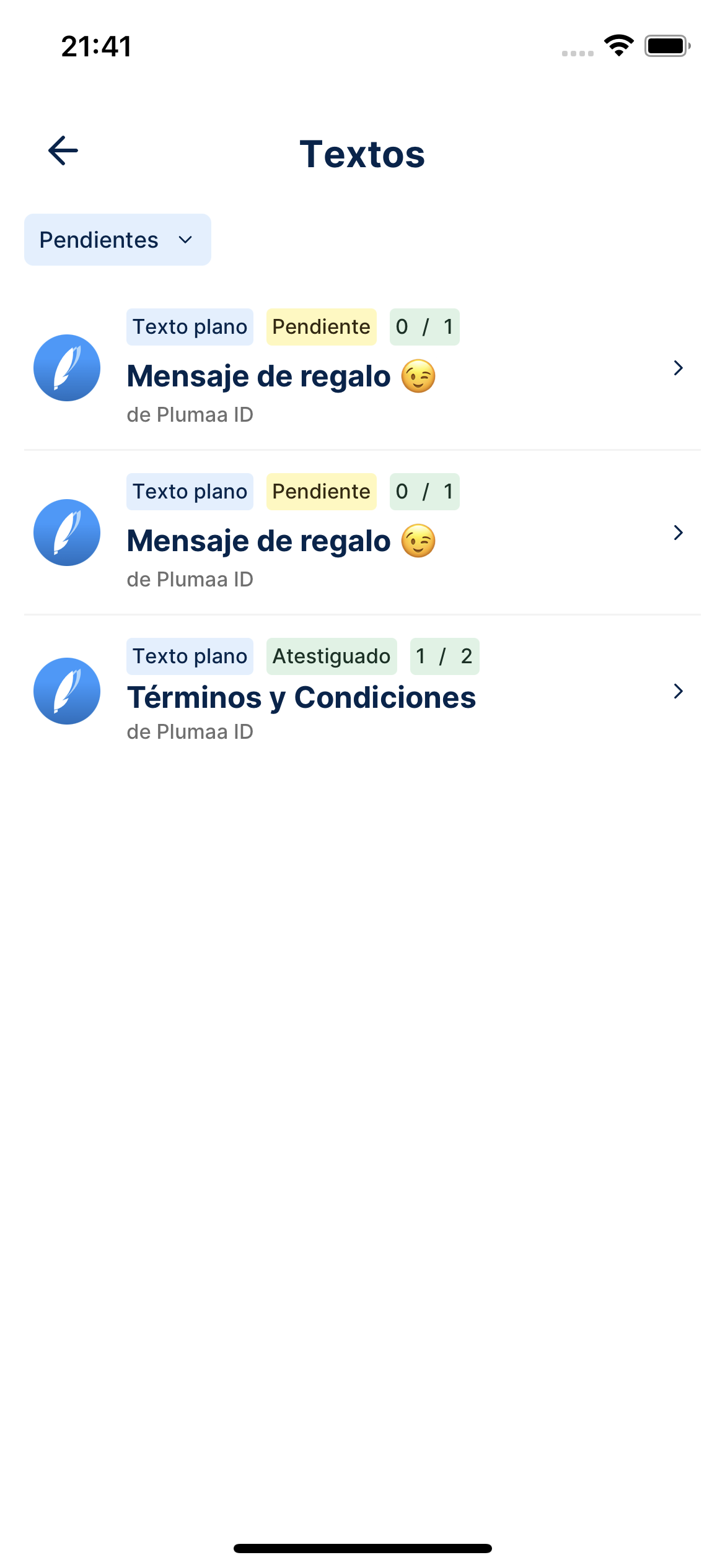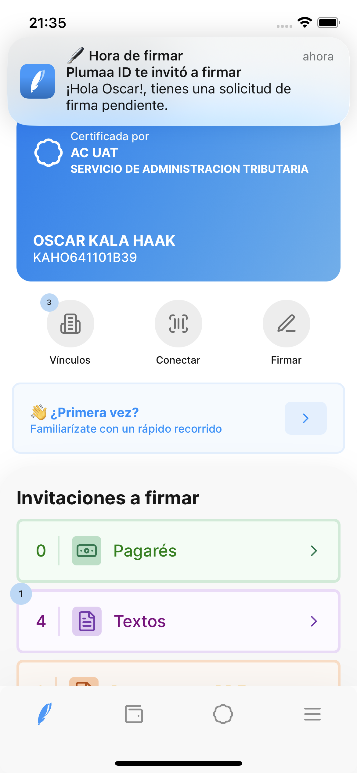 A través de la aplicación móvil recibirás una notificación cuando seas invitado a firmar un mensaje de datos. Abre la aplicación e identíficalo de acuerdo a su categoría.