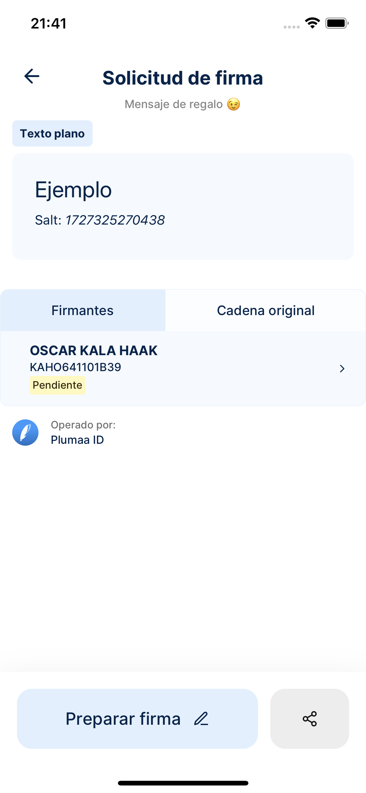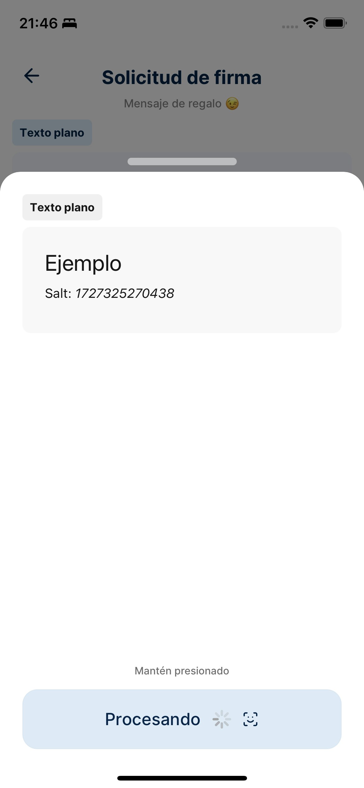 La aplicación móvil incluye un botón con el que puedes crear mensajes de texto simples para probar la funcionalidad de la aplicación. Tan sólo selecciona la sección que diga “Firmar” en la pantalla principal de la aplicación y escribe el mensaje que deseas firmar. La aplicación móvil creará un mensaje de datos en texto que podrás firmar posteriormente.